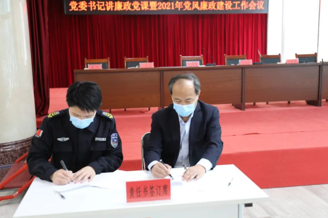 市保安服务公司党委书记刘曰温讲授了“守纪律、改作风,加强党风廉政建设”主题廉政党课,传达学习集团公司《2021年党风廉政建设工作要点》,安排部署公司2021年党风廉政建设工作。各大(中)队、部室相关人员分别签订了《2021年党风廉政建设目标责任书》《2021年党建工作目标责任书》和《廉洁从业承诺书》。