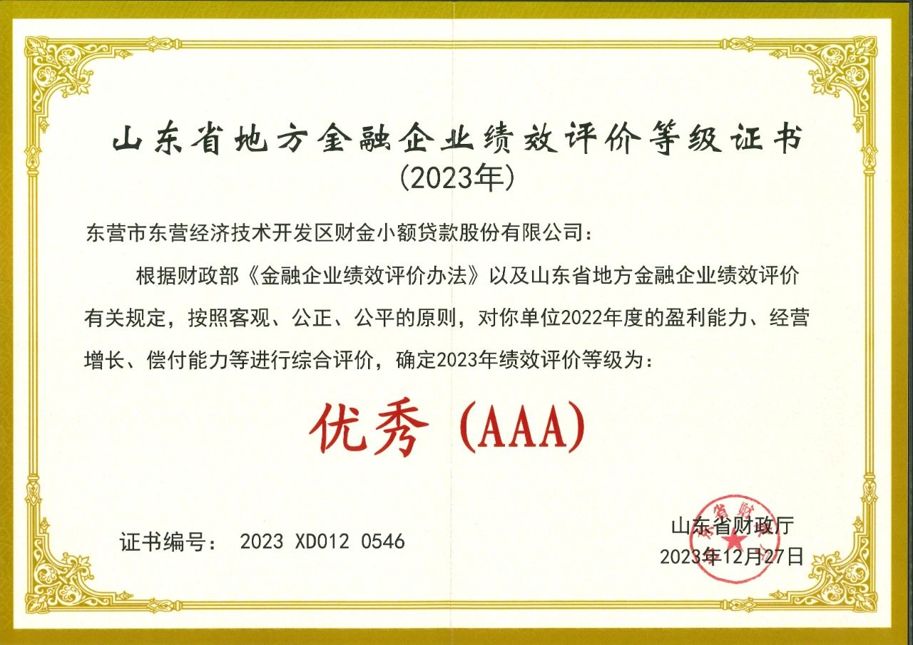 近日,在山东省财政厅组织的2023年地方金融企业绩效评价工作中,东营市东营经济技术开发区财金小额贷款股份有限公司连续第三年荣获优秀“AAA”等级的评价结果。