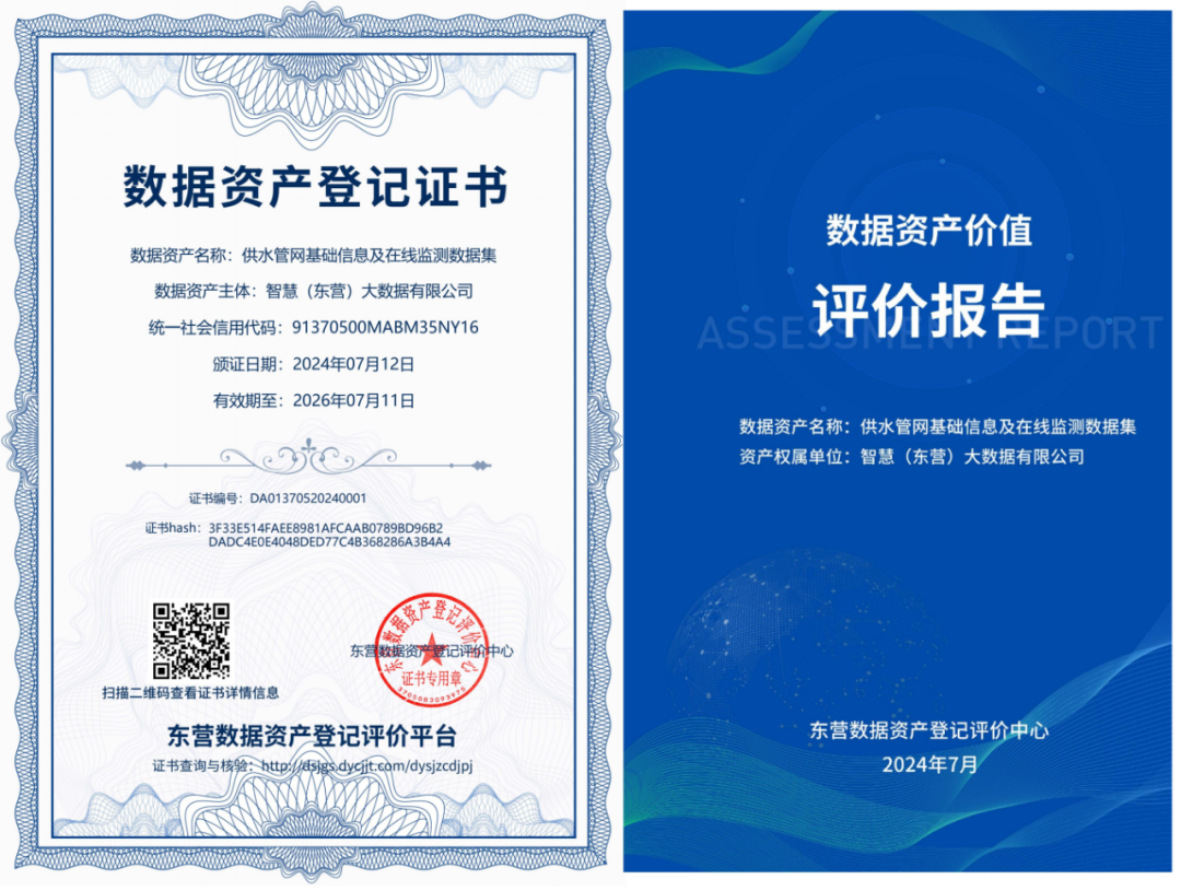 在东营市大数据局指导下,智慧(东营)大数据公司依托国企背景和资源优势,以东营市算力中心“城市大脑”智慧水务应用场景为载体,开展数据资源梳理、治理和价值挖掘等工作,形成“供水管网基础信息及在线监测数据集”,通过自研+外学的方式总结提练了数据资源梳理、合规报告、数据资产登记、质量评价、数据资源入表的方法和路径,顺利完成了数据资产化全流程工作。