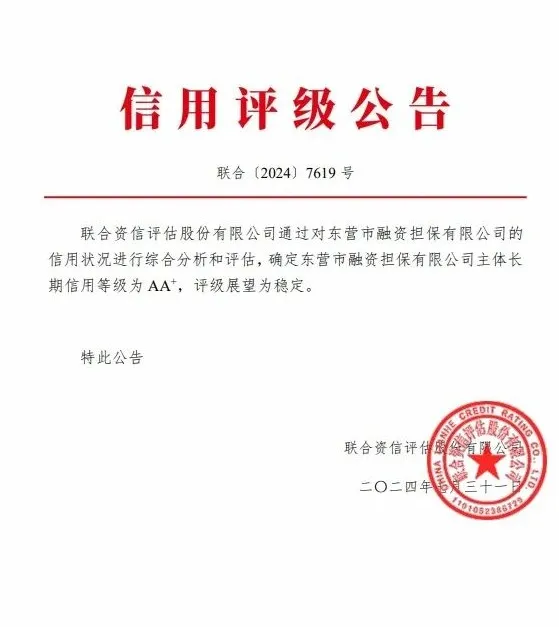 7月31日,经国内权威评级机构联合资信评估股份有限公司综合分析和评估,市财金集团子公司东营市融资担保有限公司成功获得AA+主体信用评级,评级展望为稳定。至此,集团拥有3家AA+主体信用评级公司,充分表明评级机构及资本市场对于公司在综合实力、公司治理、信用水平、发展前景等方面的高度认可。